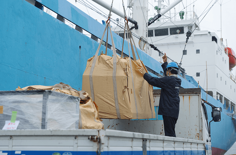 岸壁での納入品積込。物量が多いときはクレーンで搬入していただくこともあります。